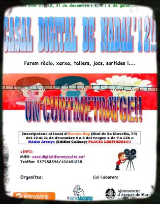 Aquest any tornarem a fer Casal Digital per Nadal!!! concretament els dies 27, 28 i 31 de desembre i els dies 2, 3 i 4 de gener. L'horari serà pel matí de 9 a 13h i el farem l'Espai Jove del Calisay i a les instal·lacions de Ràdio Arenys. El preu serà de 40 euros les dues setmanes i de 30 euros per una setmana. Les places són limitades, si esteu interessats podeu enviar un correu a casaldigital@arenyatues.cat mateixa o trucar al 93.795.85.96 (De dilluns a divendres de 18 a 20h) o al 626.651.258.