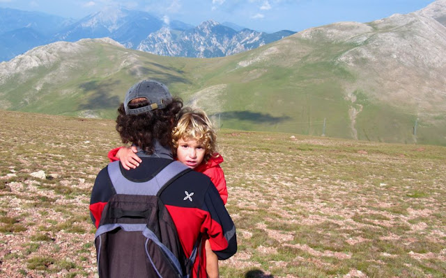 Als cinc minuts ja arrossego la llengua. El pare no calla... que si ja es veu Ensija, que si allò és el Pedraforca, el Refugi del Niu de l'Àliga per allà, la Cerdanya, el Catllaràs, la tèrmica del Cercs, compte amb la caca de vaca... no se li acaba mai la corda? Així que passo a l'acció i dic les meves paraules màgiques: "A coll!!!" Ràpidament s'acaben les magistrals classes de geografia d'apeu i el pare passa al recurs del conte. Agafada de la seva mà, l'escolto amb molta atenció... tanta que mentres ell explica jo m'oblido del camí. Avui m'ha explicat un de molt llarg sobre les bruixes de la Cerdanya i les del Berguedà que es trobaven a Coll de Pal, i com a una se li trenca el pal de l'escombra i l'aconsegueixen al Puigllançada. Jo estic gairebé segura que se'ls inventa al mateix moment, però m'agraden tant! Al darrera ens segueixen l'Ivó a mà de la mare. Com camina també el meu germanet! Clar que la mare també li ha d'explicar un munt d'historietes :-)