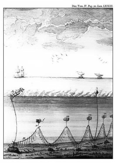 [2] Palangre a penjar segons una il·lustració del “Diccionario histórico de los artes de pesca nacional” del mataroní Antoni Sañez i Reguart (1791)
