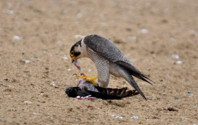 Els humans sempre ordenem els pensaments i les coses que a la natura estan desordenades. Ens agrada fer rankings, el més gran, el més petit, el més... ràpid. Aquest és el cas del falcó peregrí (Falco peregrinus). Aquest ocell preciós pot assolir els 300 km/h quan baixa en picat per capturar les seves preses, que solen ser altres ocells, sobretot coloms (com el de la foto), tudons, estornells i d'altres aus de mida mitjana. És un depredador magnífic doncs té un èxit en els 10% dels intents de caça, que pot semblar baix, però és el més gran dels depredadors estudiats arreu del món. Gràcies a això ha estat molt utilitzat des de l’antiguitat sobretot a l'Edat Mitja on el seu us era reservat a prínceps i reis. Eren coneguts els falcons de Montserrat  pel fet de que com tenien el niu a dalt de la muntanya, en portar les preses al niu, des de la plana, estaven molt musculats.