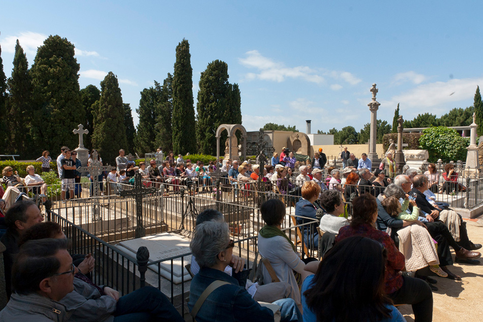El diumenge 12 de maig, al Cementiri d’Arenys de Mar vam poder escoltar els 30 poemes de Cementiri de Sinera meravellosament dits per la Gemma Sangerman i acompanyats pel clarinet de l’Oriol Romaní, que va anar des de la interpretació més senzilla fins a alguns moments jazzístics. Davant l’ermita de la Pietat, i molt a prop del lloc on reposa Salvador Espriu, la veu de Gemma Sangerman va resseguir el poemari que no podia trobar un marc més adequat per ser dit i escoltat. Com ella mateixa comentava després de l’acte, les paraules li fluïen amb facilitat perquè ho tenia tot davant seu: un tros de mar retallat entre xiprers. D’allà n’anaven sortint el carro, les vinyes, els rials, les barques. El punt de vista dels assistents era un altre: la campana de l’ermita, les escultures dels panteons, els Tres Turons i també els xiprers. Ni les abelles que rondaven pel recinte, ni el xut tímid de la pilota d’un nen, ni les preguntes que se sentien al fons sobre la ubicació exacta de la tomba de Salvador Espriu, no van aconseguir trencar la concentració i emoció dels assistents.