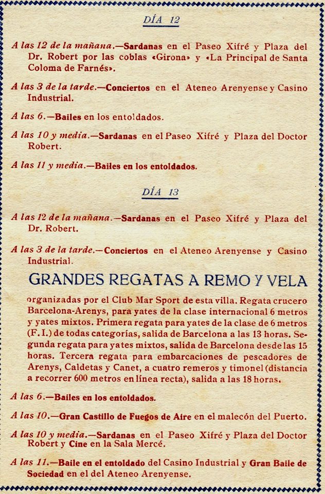 El segon programa i la segona fotografia corresponen a la Festa Major de 1930. La imatge correspon a la festa de natació organitzada pel Club Natació Arenys el 13 de juliol, quarta edició de la travessia d’Arenys (2000 metres). L'emplaçament es a la platja del davant mateix de la vila. I un altre canvi important és la llengua que utilitzen un i altre programa, que constata la fi de la dictadura de Primo de Rivera -finals de gener- i la recuperació de certes llibertats.