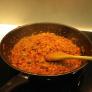 En una paella amb una mica d’oli, fem el sofregit de ceba i pebrot, tallat ben petit i els tomàquets rallats. Quan estigui quasi fet incorporar la carn dels musclos i rectificar de sal, si el tomàquet surt àcid, afegir-hi un polsim de sucre.