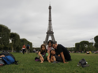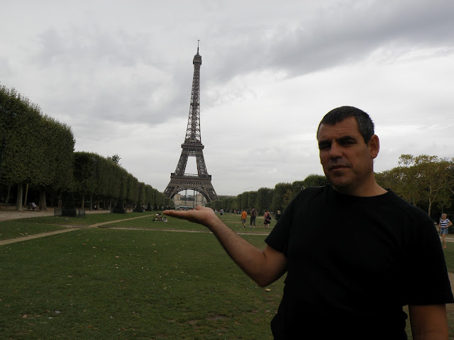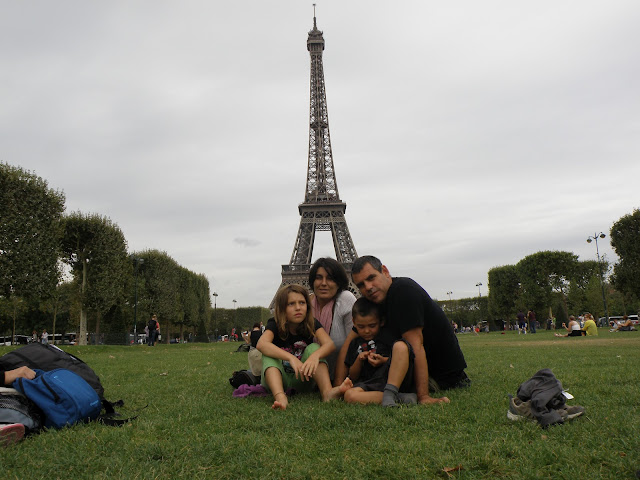 Un cop vista i revista la torre, baixem i decidim fer una passejada per els Camps de Mart i fer les oportunes fotos de la torre amb perspectiva. Els nens més petits corren i fan volteretes a la gespa i alhora els més grans busquen xapes pels voltants. Els adults, descansem i mirem la gent com passa.