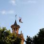 Vaig tenir la xamba de poder baixar en tirolina des de la part més alta del campanar, allà on la campana més grossa ens diu com s'esmunyen els dies i s'escapen les hores, allà on el rellotge es fa sonor. En aquell espai iniciava la meva excursió/aventura. L'Àngel Pruna i l'Alfons Majó, en ben cordaven els estris per assegurar-me amb tots els ets i uts. Fins em ficaren un casc que no acabo d'entendre al seva funció. Realment si caus, t'esclafes de mala manera. Potser serveix per evitar que el cervell s'escampi, escampant-se també les poques idees que encara em queden.
